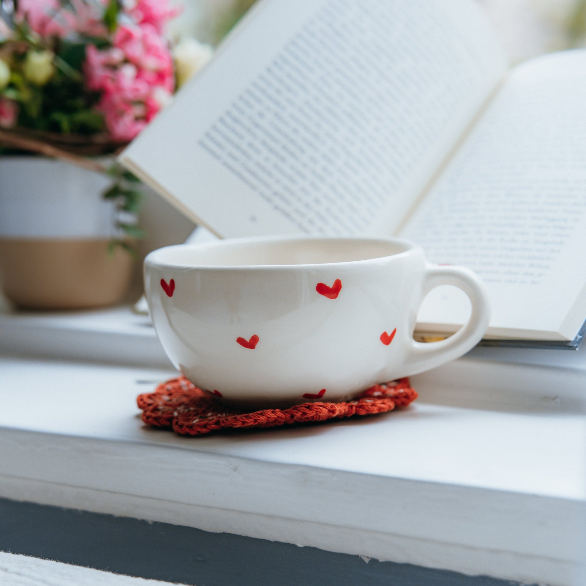 Handmade in Mexico, with a soft finish and hand-painted hearts. Microwave-safe (handle with care) and dishwasher-friendly (hand wash recommended).